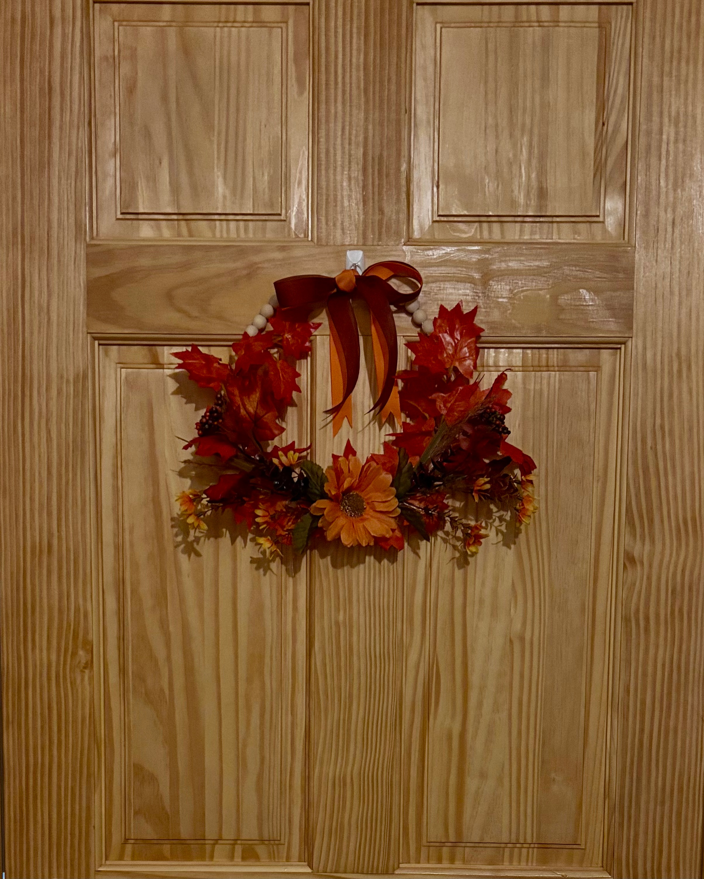 For the past two weeks, my mom and I have been making fall and Christmas wreaths—one for her door and one for mine. We collected an assortment of fake florals from inexpensive stores. These autumn colored array of flowers were placed at the bottom of wooden craft wreath rings and hot glued onto the beaded wreath to form a symmetrical bouquet. At the top, we placed an autumn colored ribbon to finish our first projects off. These took only a few minutes to create and dry off. This idea came from my research on YouTube. What a great idea it was, too. Each time we enter the house we feel the joy of the season when seeing the wreaths we made on our doors.