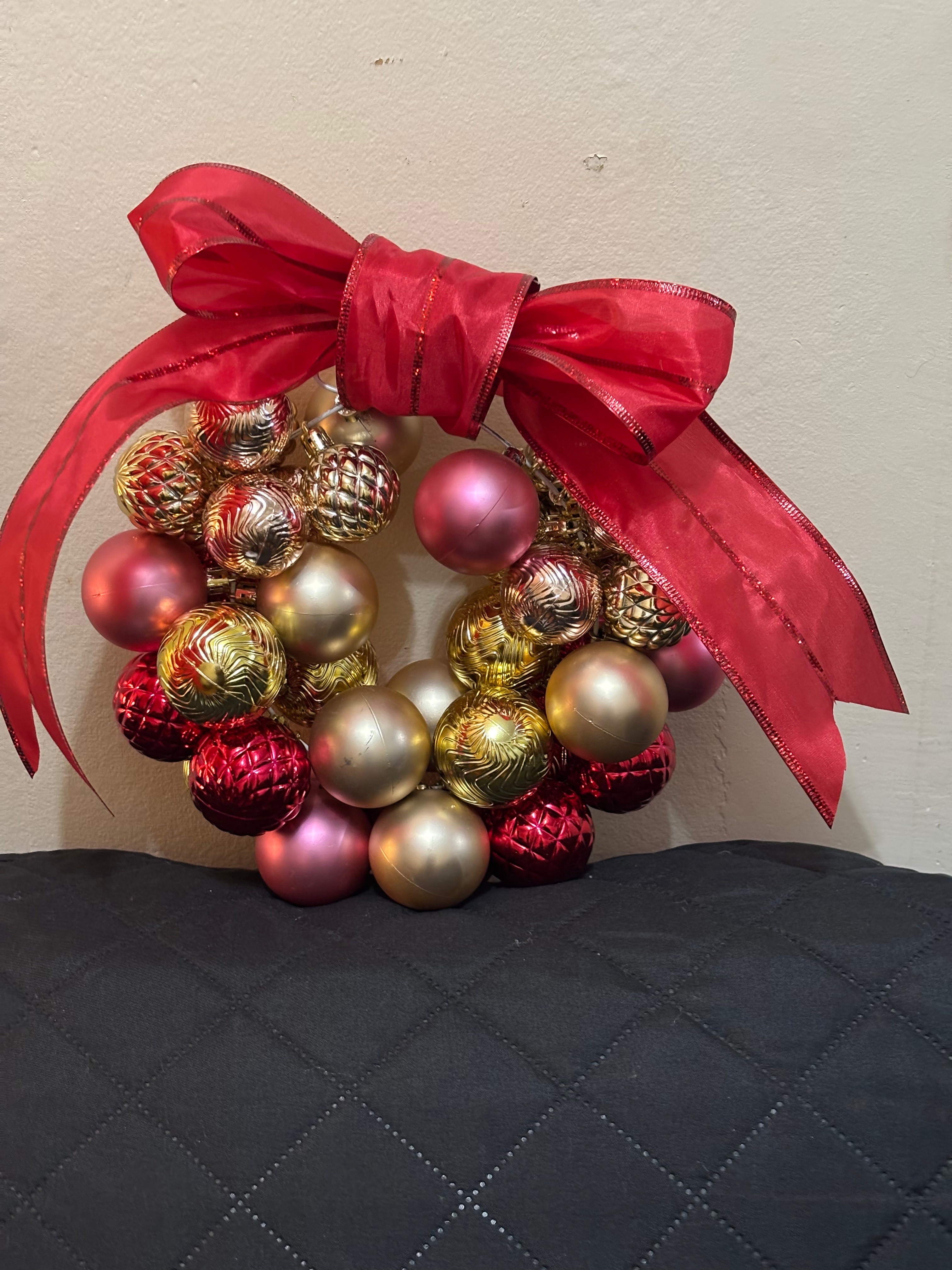 Later, I gathered the materials to make our Christmas wreaths. Again, I shopped at an inexpensive store to buy these round Christmas tree balls in various colors. However, I used some old metal coat hangers to create the round base of the wreath. Here’s a tip: If you use the coat hangers for this craft, make sure to use hangers that bend easily. I had a tough time bending our hangers into a circular shape. It was also difficult to twist the ends back together after placing the ornaments on the hangers. I had to use a plier to finish both or wreaths off. Yet, our Christmas wreaths turned out to be beautiful as well. We won’t display them until December, though.